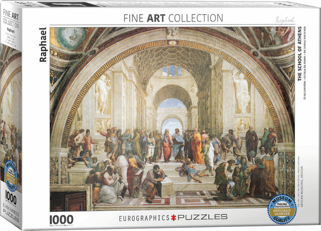 EuroGraphics School of Athens by Raphael 1000-Piece Puzzle. Box size: 10" x 14" x 2.37". Finished Size: 19.25" x 26.5". Raphael's masterpiece features the most famous philosophers of ancient times moving within an imposing Renaissance architecture. The list includes none other than Aristotle, Plato, Socrates, Pythagoras, Heracleitus, Diogenes and Ptolemy to name a few. Strong high-quality puzzle pieces. Made from recycled board and printed with vegetable based ink. This superior quality puzzle will delight and educate all at the same time.