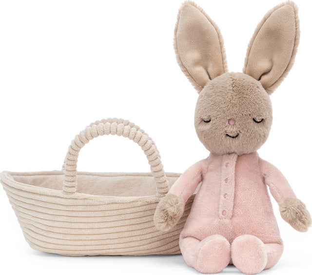 Rock-a-Bye Bunny is a peaceful poppet, dozing in a cordy beige basket. If you're very gentle, you can pick up this pippin for a teeny-tiny bedtime cuddle. With praline fur, a sweet pink onesie, sleepy stitch eyes and petal ears, this hoppity hon's dreaming of yummy lettuce!