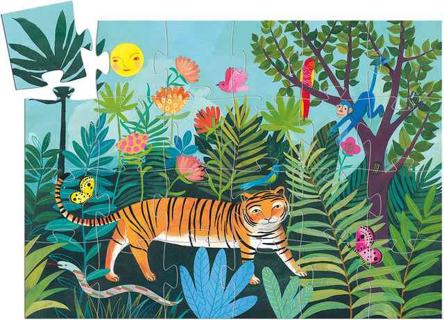 Let’s travel to the jungle and see the beautiful tiger in his natural habitat; can you find the sun, flowers, birds and monkey?. Packaged in a unique box shaped like a beautiful striped African tiger; 24 pieces, each puzzle is 16 x 12 inches. Helps develo