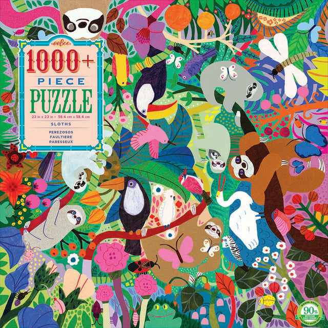 What a lively design! There's no top and no bottom – just like sloths see the world – so puzzle solvers can work from any side. Recycled board printed with bright vegetable-based inks. Finished size is 23" square.