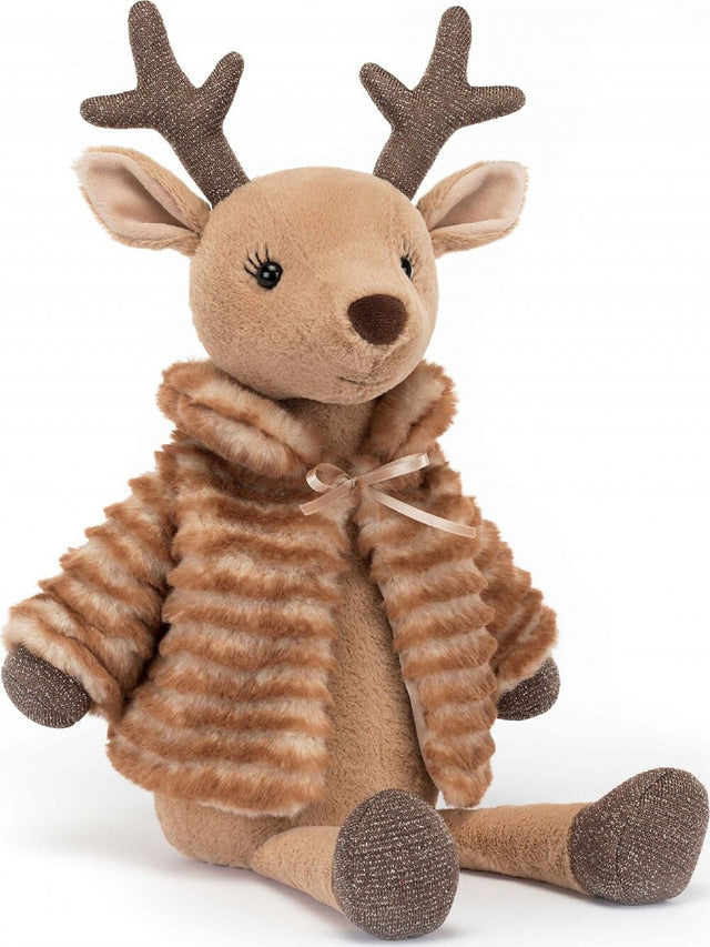 Announcing the divine Sofia Reindeer! This glam deer is the epitome of Christmas chic. Sofia wears a fluffy coat in creme-caramel stripes, with a ribbon tie and champagne lining. It goes perfectly with her dark-chocolate nose, embroidered lashes and glittering hooves and antlers.