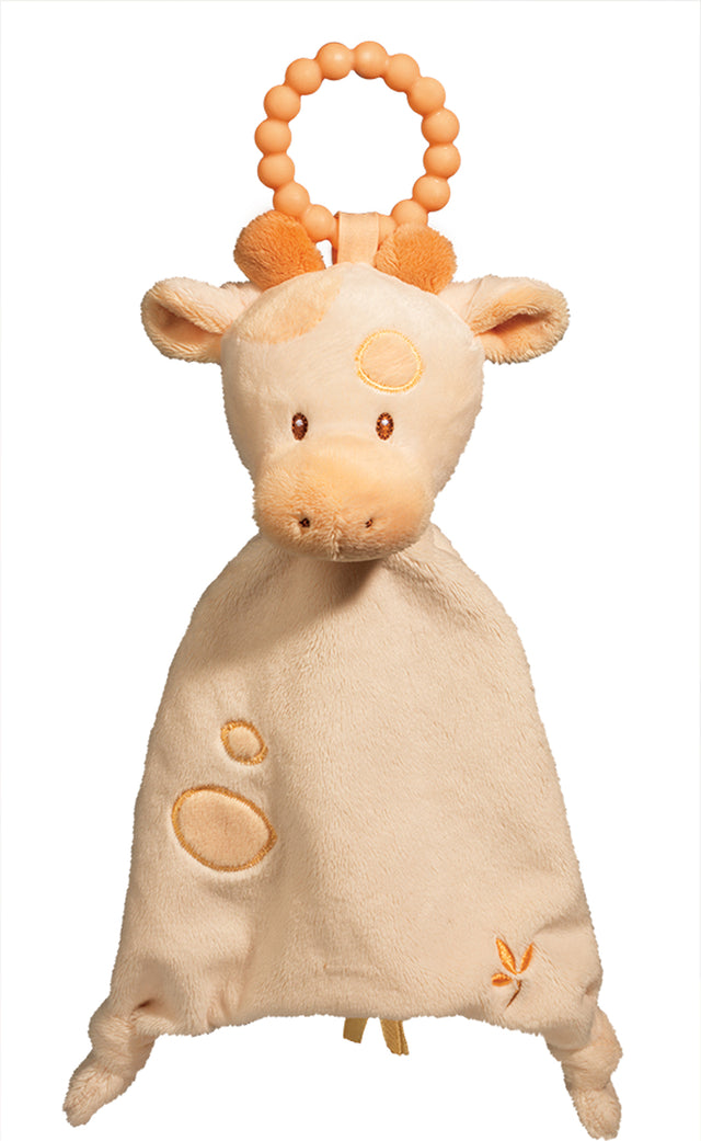 Spotted Giraffe says chew (and snuggle) away! Luxuriously soft materials of our best-selling Sshlumpie with the added bonus of a teether ring built in! 1% silicone is safe and soothing for baby.