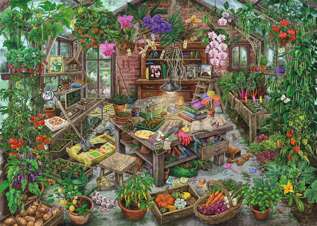 Something strange is happening in your aunt's greenhouse! All was well until yesterday when the plants and flowers stopped growing and the vegetables were suddenly inedible! The likely suspect is her nasty neighbor with a penchant for black magic. Can you follow the clues and solve the brainteasers hidden in the puzzle to free the plants from this dark spell? Read the story, assemble the puzzle, solve the riddles, then piece together your escape! (Instructions and solution envelope included.)