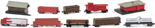 Toob includes: Freight Station, Cargo Car, Log Car, Coal Car, Fuel Car, Coal, Train Engine, Passenger Station, Caboose, Cargo Car and Dump Car.