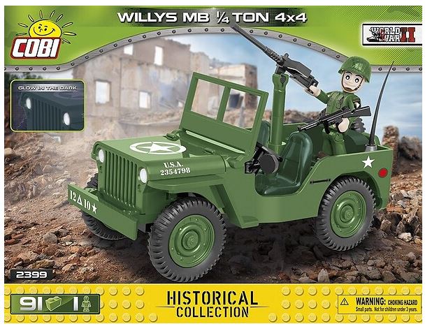 This car model comes from the world of COBI. The characteristic shapes of the historic vehicle have been faithfully mapped using high-quality bricks. This model utilises printed details rather than stickers that are not only durable but gives fantastic detail. Rotating wheels equipped with tires are ideal for moving the model during play. Under the tilting hood there is an engine, which, like the interior of the vehicle, can be freely modified according to your needs. An American soldier's figure is included in the set.