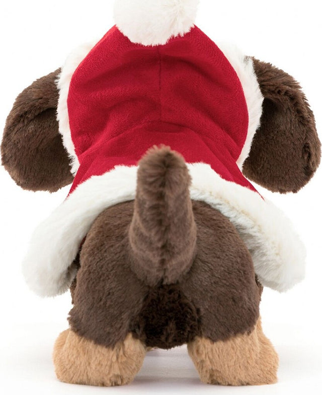 Winter Warmer Otto Sausage Dog is setting new trends for holiday fashion! This floppy-eared pup wears a bold red hat-and-cape combo, with a fleecy trim and bobble pompom, which fastens on with a red ribbon tie. It goes so well with Otto's cocoa fur, splashed with caramel patches!