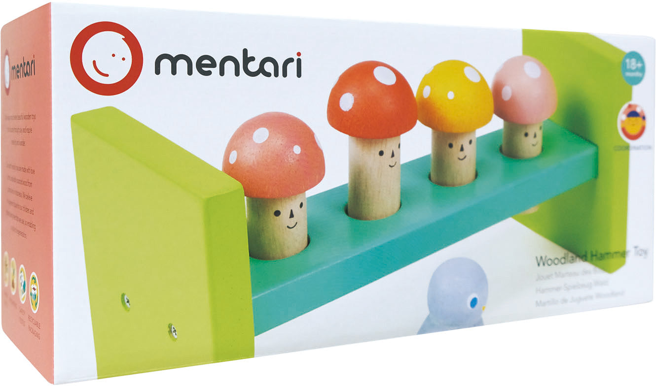 Little learners explore and discover with every bang of this classic wooden pounding toy! A timeless entertainment, kiddos use the bluebird hammer to pound 4 smiley-faced toadstools down. Then they'll giggle with delight as they turn it over to pound them back up again! Builds fine motor skills, hand-eye coordination, and teaches cause and effect. We love that Mentari toys are sustainably made and come in recyclable packaging.