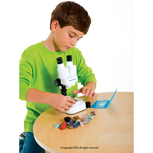 Zoom in on learning, with this portable, lightweight, high-quality, best introductory stereo microscope. My First Lab® World of Wonder Scope features real glass optics, built-in light, comfy eyepieces and 50x magnification. Requires 2 AA batteries. For ages 7-12 yrs, from C & A Scientific.