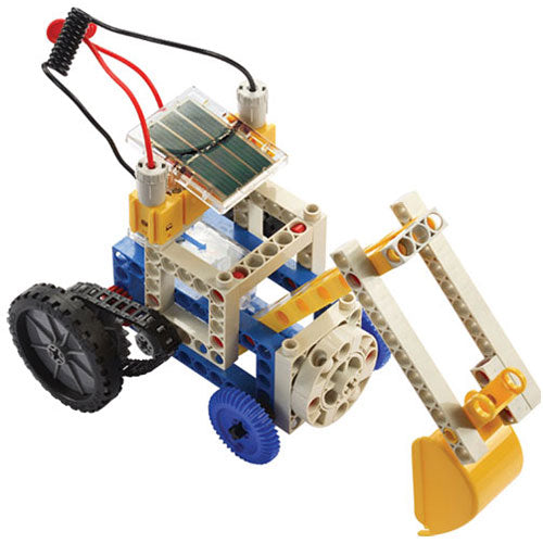 Build your own solar-powered models and discover how solar cells generate electricity from light. Build six solar powered models including a locomotive, single-prop plane, bulldozer, helicopter, backhoe, and twin-rotor helicopter. The special solar panel in this kit consists of three solar cells and generates 1.5 volts of electricity in bright sunlight, like a AA battery. A unique cradle holds either the solar panel or the battery, allowing you to switch out the solar panel for a AA battery (not included), depending on the strength of sunlight. You can even use the solar panel to charge up your own rechargeable AA batteries. The solar panel is positionable, so you can experiment by adjusting it to different angles thereby maximizing its exposure to the sun to generate more power. After you have built the suggested models, you can design your own solar vehicles. Compete with your friends to see whose solar vehicle runs the fastest! 24-page color instruction book. 177 building pieces.