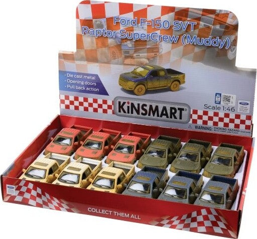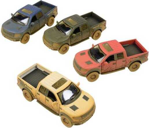 12 per box These Ford trucks have been off-roading and have the mud splatters to prove it. Pull back action with opening doors Made of metal and plastic Item 5" L. x 2" W. x 2" T., 1:36 replica scale No package Display with assorted colors Age 3+