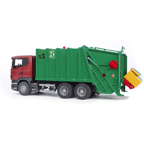 It's time to take out the trash with the SCANIA Rear Loading Garbage Truck (Red-Green) 03561 by BRUDER!