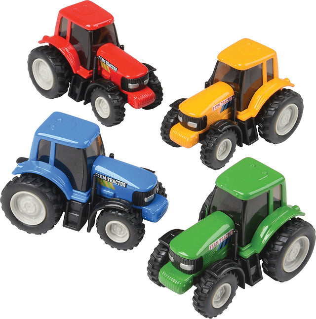 12 per box Toy farm tractor that children will love Pull back and watch 'em go Made of metal and plastic Item 4" L. No package Display with assorted colors Age 3+