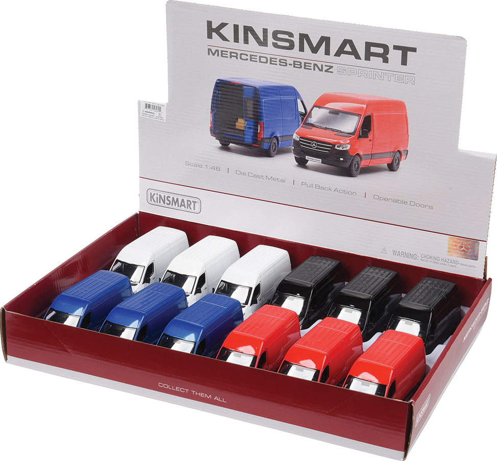 12 per box Race in style with this collectible Mercedes Benz Sprinter Pull back motor action and opening doors Made of metal and plastic Item 5" L., 1:36 Scale replica Display with Assorted styles Age 3+