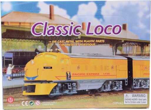 12 per box All aboard the pacific express model diecast train Pull back action Made of metal and plastic Item 7" L. x 2" W. x 2" T No package Display with assorted colors Age 3+