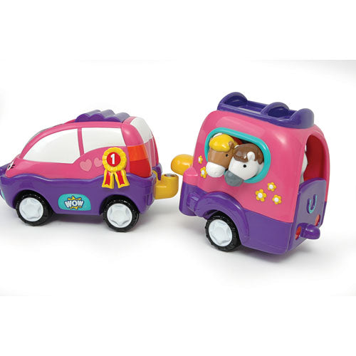 Clip-clop, clip-clop - here's a happy pony set! This cute and chunky nine-piece set features a friction-powered car with a realistic engine sound, detachable horsebox with a magnetic hook, push-button tailgate, shape-sorting roof rack, girl and boy riders, two color-coded ponies, a pony jump, and two stackable hay bales.