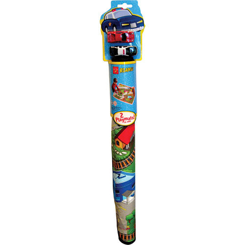 Neat-oh!(r) Roadville Large 2-Sided Playmat One side of the mat is a vehicle and train lovers delight with artwork depicting a village with roads and rails. (the tracks are the same gauge as most wooden trains.) the other side has a mechanic's shop, gas station, quarry and roads which need repair and construction. Neat-oh!(r) Roadville includes 2 die cast cars. Neat-oh!