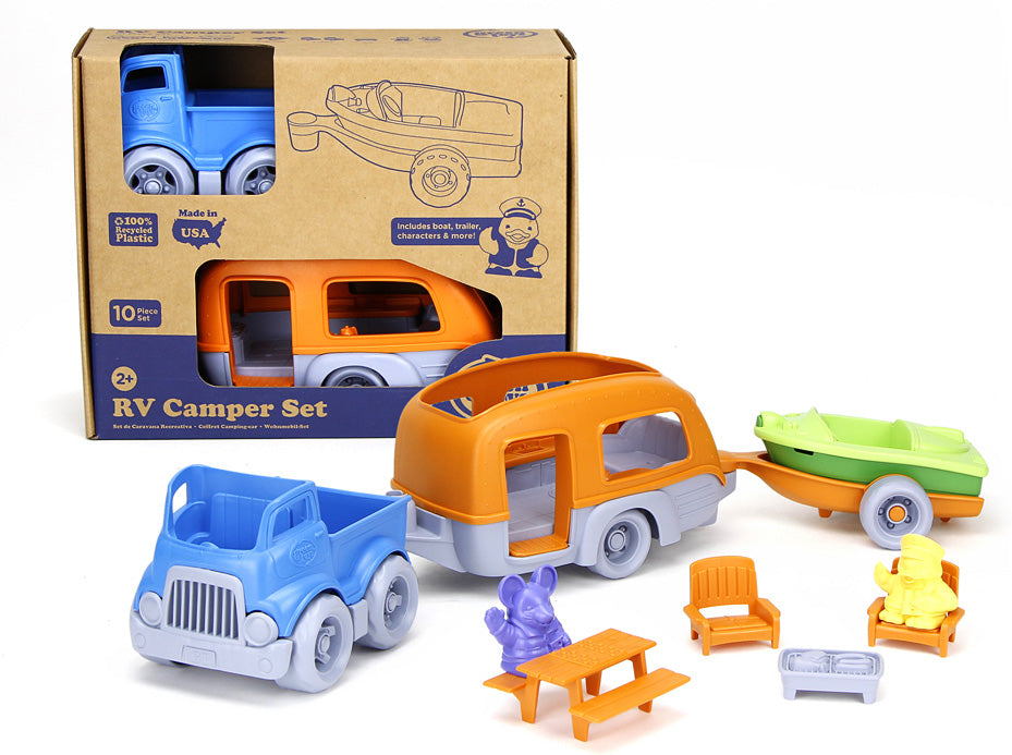 This colorful, 10-piece set is ready for a road trip! Camper, pickup truck and boat, plus accessories that include 2 people, chairs, table and camp stove, lead to endless narrative fun, indoors or out. Made in the USA of recycled materials, with no BPA, phthalates or PVC, for an eco-friendly adventure.