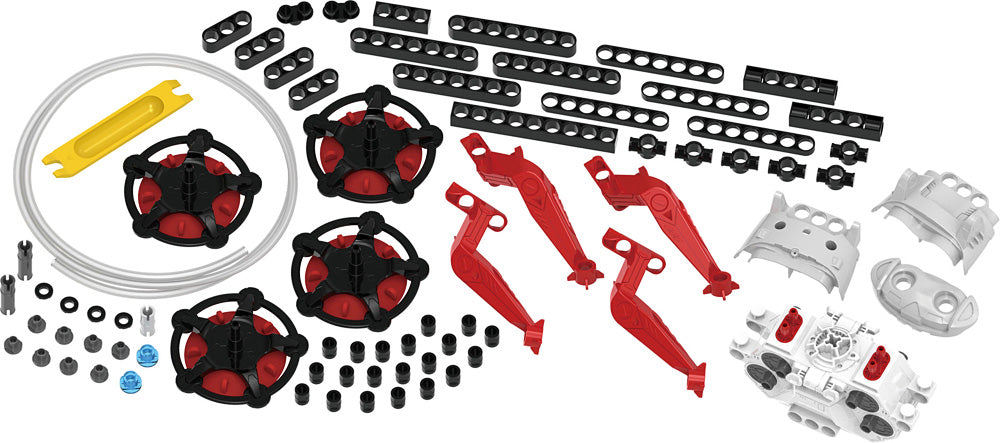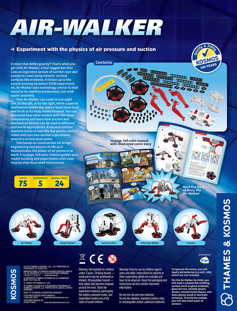 Gravity will be so confused! This 4-legged bot uses suction cups and pumps to walk clear up the wall. Hands-on engineering, physics, and fun are brought to life, with the help of a full-color 24-page manual. Lots of extra experiments, too! Requires 2 AA batteries.