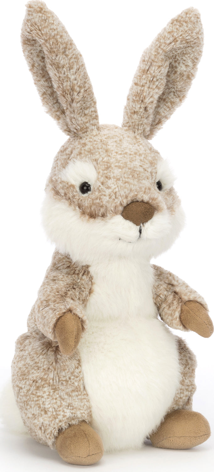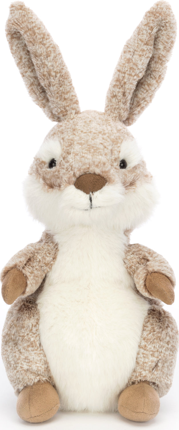 Ambrosie Hare is oatmeal-cozy, with snow-flecked fur and golden suedey paws. With long, perky ears, expressive eyebrows, a cloudy bobtail and a peaceful smile, this huggable hare is such a soothing pal. A gorgeous gift for happy naptimes, make-believe and comforting cuddles.
