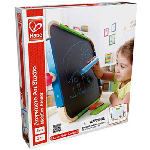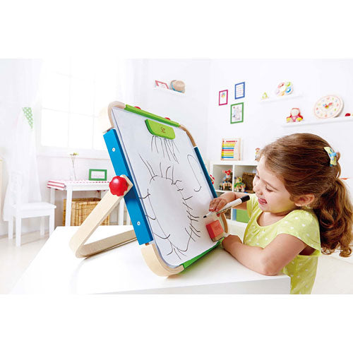 This tabletop art studio keeps artists busy with a whiteboard, chalk board, and magnetic shapes.