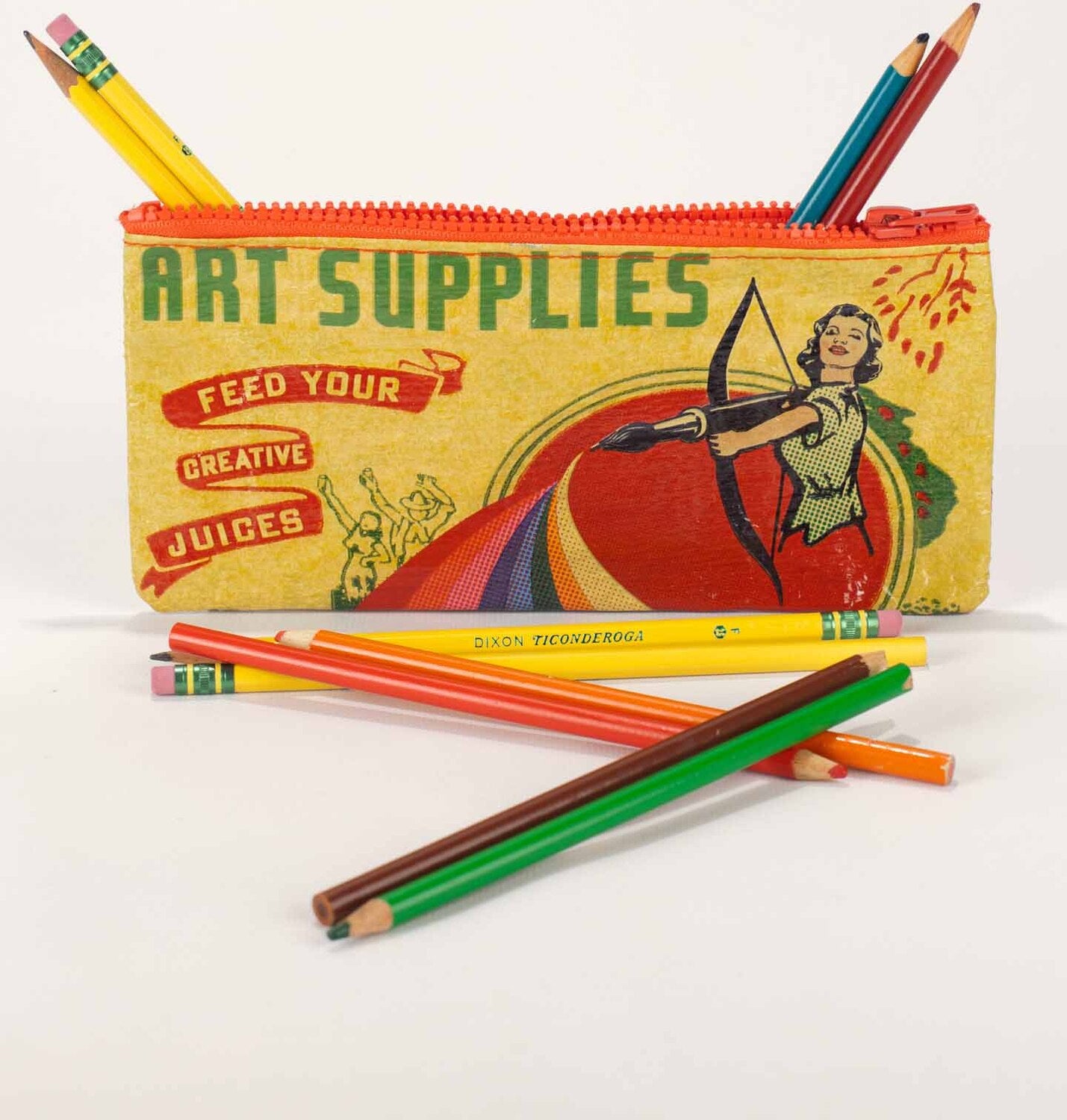 It's like having your art studio travel with you wherever you go. Awesomely convenient size. Keeps your tiny things tidy, and fits inside your other Blue Q bags! 95% post consumer recycled material.