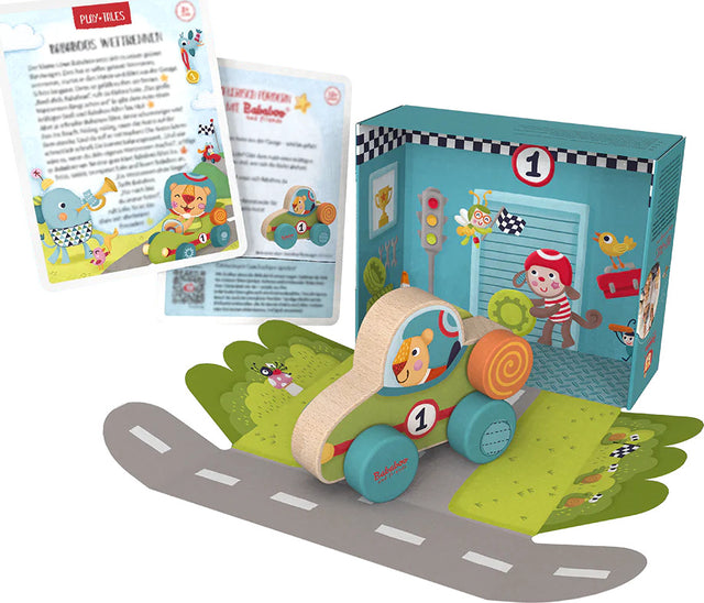 Lion Bababoo is getting ready for his first race. His wooden racecar has colorful discs that spin along as he drives. The lovingly illustrated play box "Garage" provides a perfect backdrop for imaginative play.