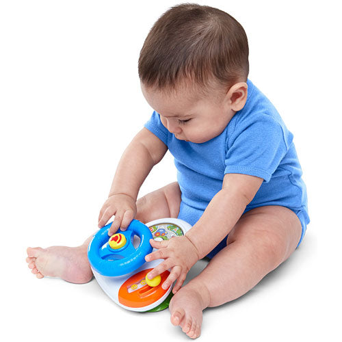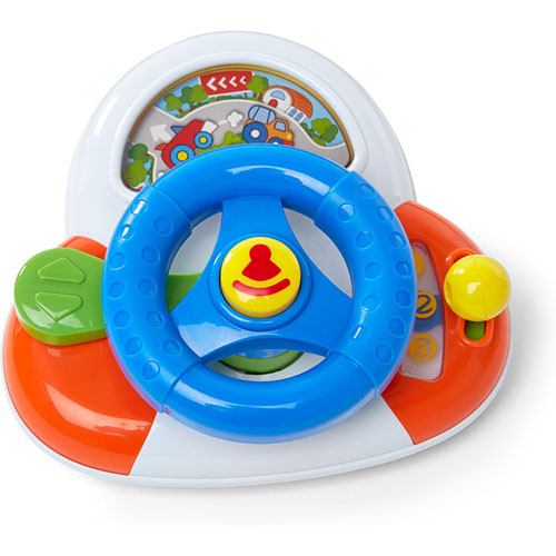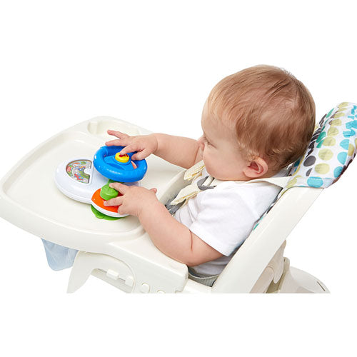 Turn the steering wheel and scenery changes. Press the squeaker horn, click turn signal and change gears. Suction cups adhere to most smooth surfaces, perfect highchair toy!