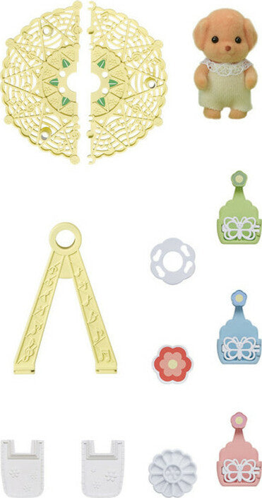 Baby Ferris Wheel includes a cute ferris wheel that can seat up to 3 babies and a Toy Poodle Baby figure.Baby Ferris Wheel's ferris wheel can be turned by holding onto the handle and turning to spin the circular base.Can be placed on top of Baby Castle Nursery (sold separately). Have even more fun playing alongside Baby Airplane Ride (sold separately).Frame (Left), Frame (Right), Gondola x3, Pole, Center Piece, Lock Piece, Handle, Base (Left), Base (Right), Toy Poodle Baby (a total of 12 pieces)