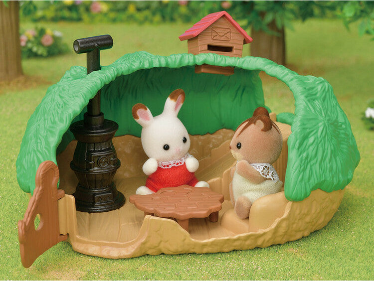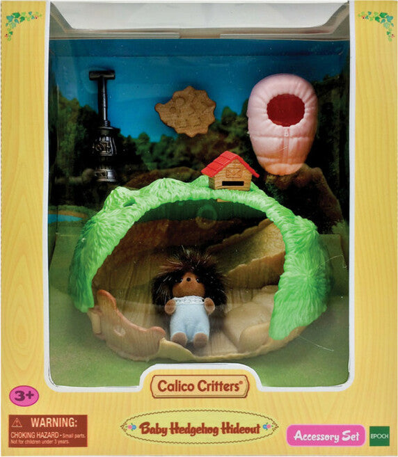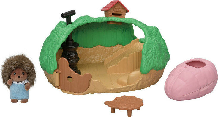 Camp out at the Hedgehog Hideout! This ready to play playset includes Pickleweeds Hedgehog baby who is poseable and dressed in removable clothing. The hideout is shaped like a Hedehog and features one room with a front door and slide, stove, table, sleeping bag, mailbox and birdhouse. Play together with other playsets from the Family Trip series including the Adventure Treehouse, Lakeside Lodge and Baby Ropeway Park.