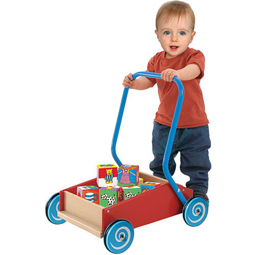 Traditional push along, study wood construction,hardwood and steel with rubber coated wheels. Ideal support for toddlers 1st steps. Blocks not included. Age: 12 months and up. Warning: Must BE ASSEMBLED BY AN ADULT. Handle height of 20". Bar Code- 693409590342.