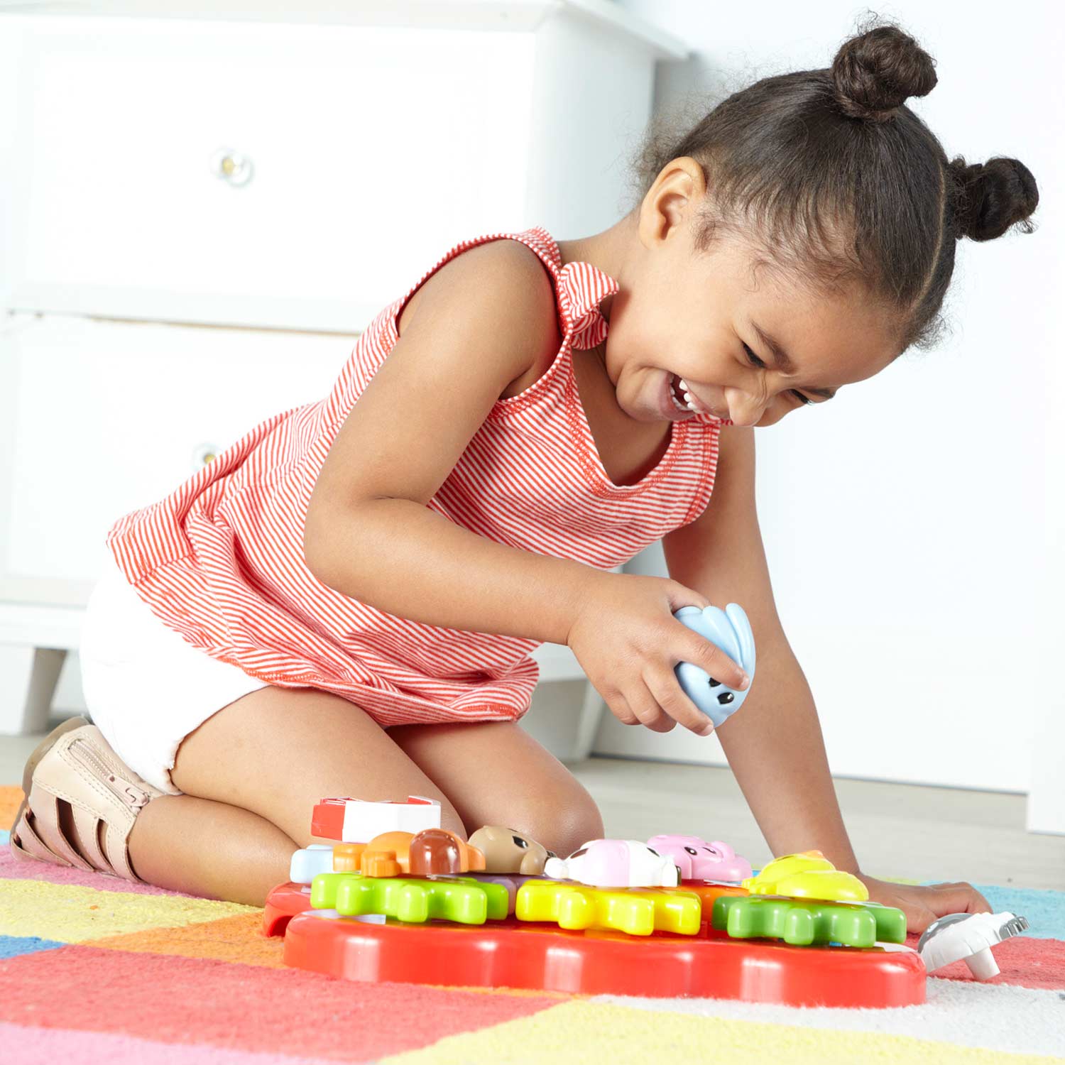 A new addition to the successful Build & Spin series that helps toddlers build motor skills through delightful, spinning gear play. The chunky gears snap into the base, allowing for take-and-play portability.Set includes 8 large gears, 7 friendly animal characters, 1 chunky farm knob, and 1 base. Featured in open packaging style that provides strong point-of-purchase appeal.