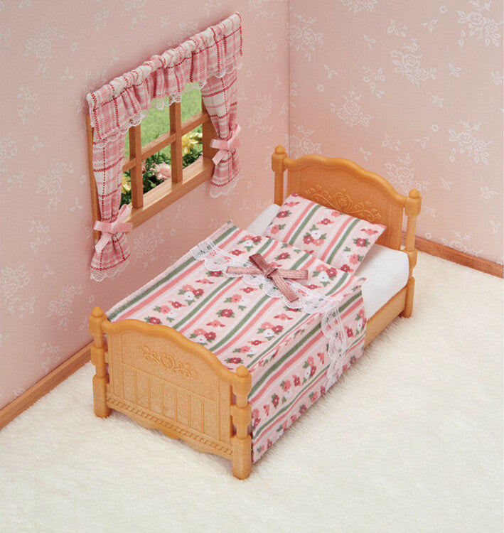 Bed & Comforter Set includes a single bed with a soft mattress, and is large enough to accommodate adult-sized figure.Bed & Comforter Set features a pillow and quilt with a cute floral pattern, and a bed frame engraved with a lovely floral pattern. The mattress shape has been designed so as to allow for a more natural sleeping position.Enjoy putting figures to bed (sold separately). Place alongside other furniture in homes such as Red Roof Country Home to create a very stylish bedroom (sold separately).Bed Frame, Mattress, Pillow, Quilt (a total of 4 pieces)