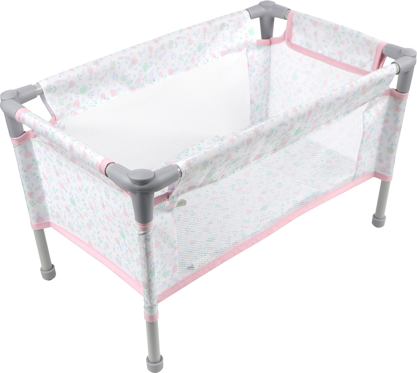 Help little ones take care of their baby doll the way you take care of them! Make-believe moms and dads will love putting their favorite baby doll to bed in this cute crib. It's easy to assemble, features a delicate pink, white, and green floral pattern, and fits dolls up to 18" long. Take nurturing pretend play with you: everything comes apart easily and fits inside the fabric carry case.