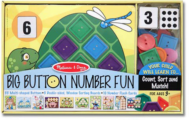 One, two, buttons for you! Packed into this kid-friendly activity set is the most colorful and fun way to practice number and shape recognition, counting and sequencing. Five double-sided wooden boards with ten whimsical designs provide insets for 10 number cards. Everyone will have fun matching the correct number cards and shapes for each board!