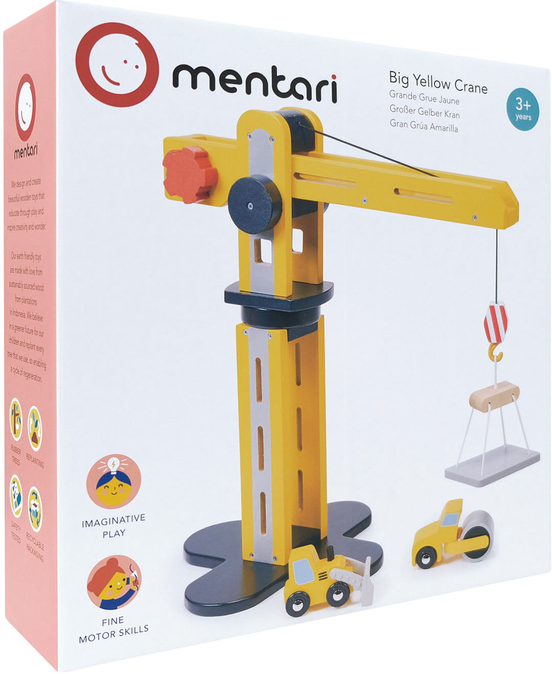 Enter the construction site and get ready to build years of imaginative adventures with this heirloom-quality wooden crane set! Future engineers use the dials to move the crane arm forward and backward and lift the hook up and down. Load the two included construction vehicles onto the platform and lift them into place on other household blocks or structures. Some assembly required.