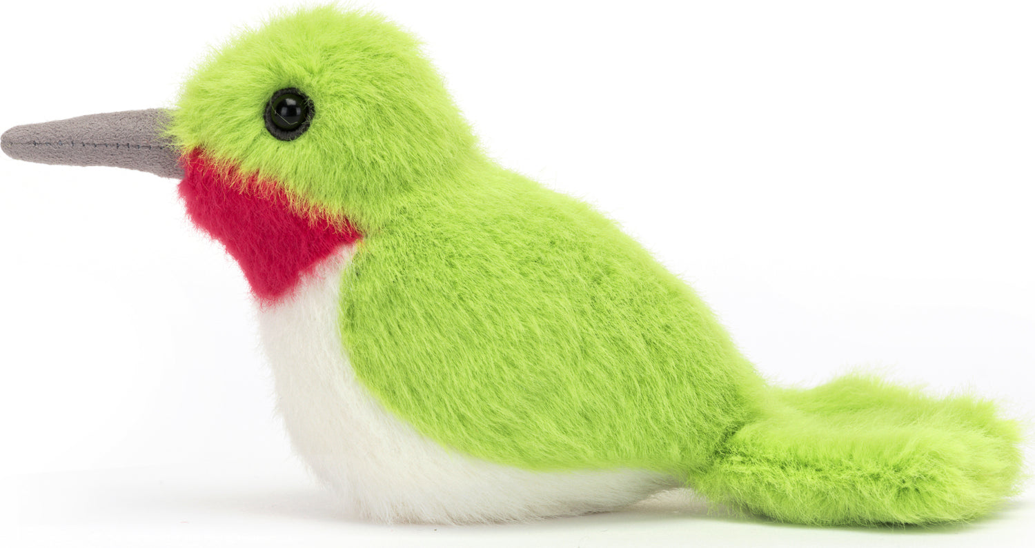 Birdling Hummingbird is a summertime sweetie in bold green and cream fur. With a long suedey beak and deep red chin, this lucky softie has a soft fan tail and is ready to fly!