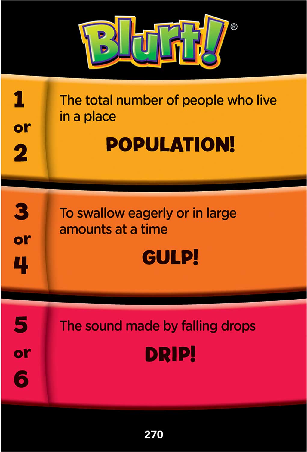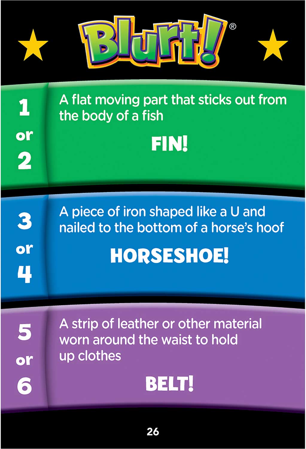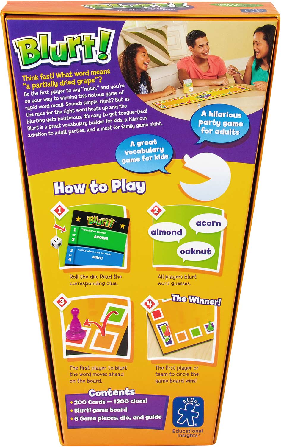 The hilarious game of rapid word recall! Blurt! Is a great vocabulary builder for kids, a hilarious addition to adult parties, and a must for family game night. Includes junior version for ages 7 to 9.