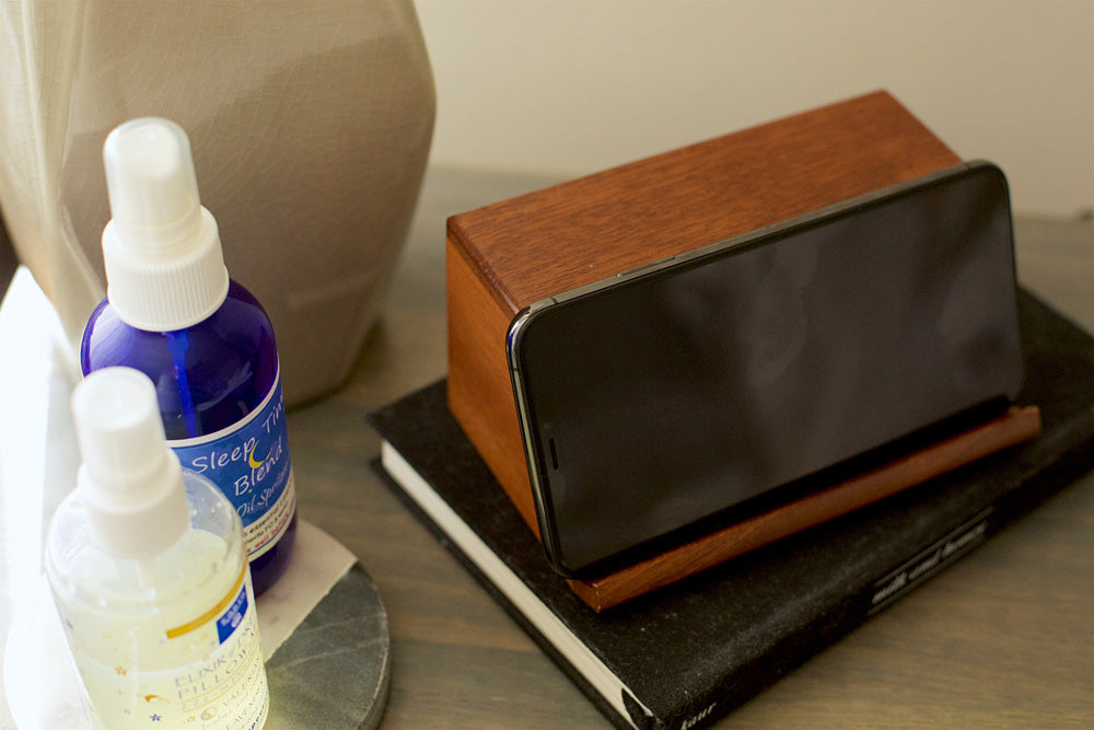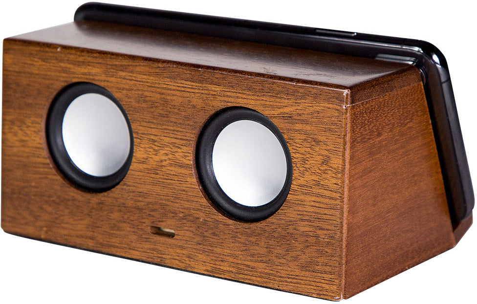 Rest your device on the ledge of this little speaker and wow! Instant big stereo sound, with no cables, wires, batteries, or Bluetooth required. Includes USB charger.