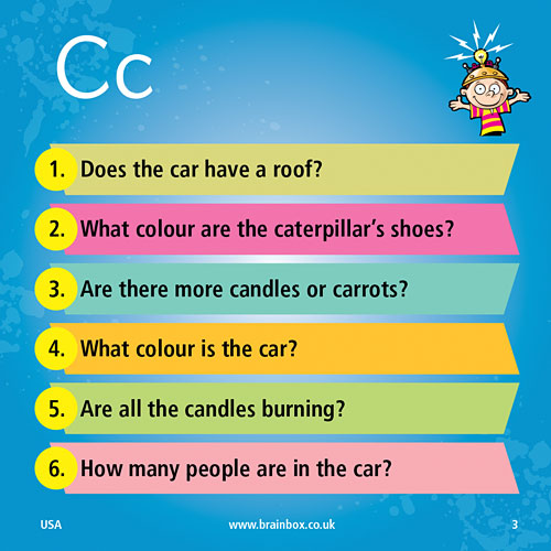 This fun and memory-boosting game helps preschoolers recognize objects that begin with each letter of the alphabet as well as common consonant blends. Players study the pictures-and-facts side of the card for 10 seconds, and then flip to the other side to see how many questions they can answer. "is the apple green or red?" "How many of the zebra's legs can you see?" Includes 55 cards, a sand timer and a die. Download Instructions