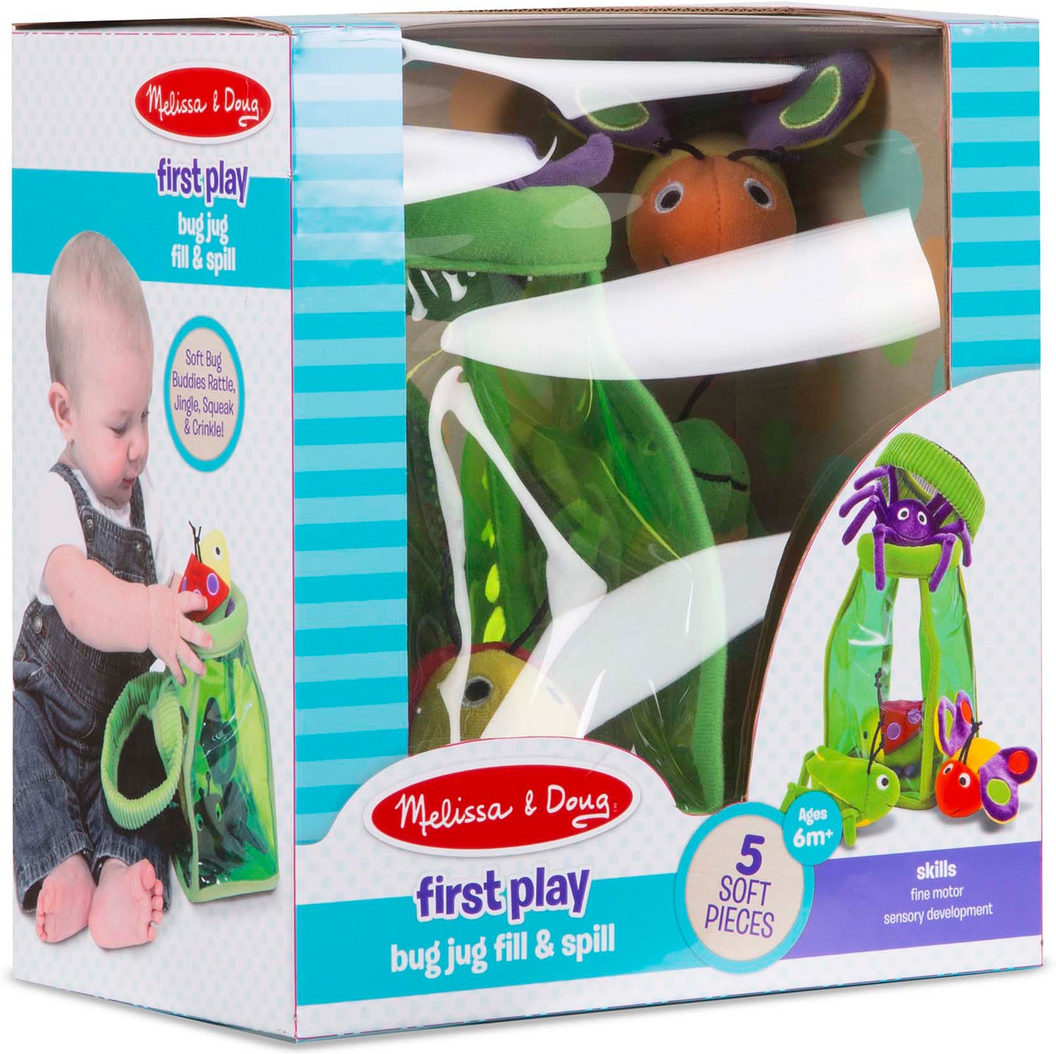 Hours of creepy-crawly fun await as your toddler delights in taking out the soft, plush spider, butterfly, ladybug and grasshopper. Manipulating these critters is even more fun because each one has a distinctive sound, jingling or crinkling just for giggles! The child-safe "jug" has a mesh top attached to keep the collection together when the bugs go back in.