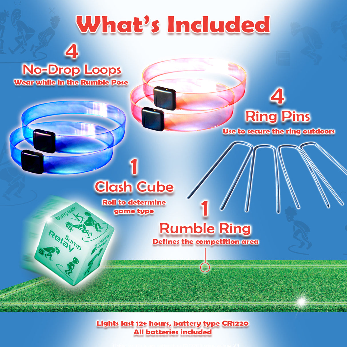 • Includes 1 Clash Cube, 1 Rumble Ring, 4 Ring Pins, 4 No-Drop Loops, all required CR1220 + LR44 batteries (lights last 12+ hours, batteries replaceable)
