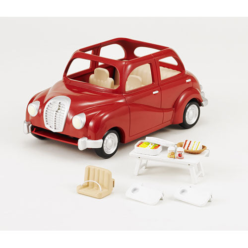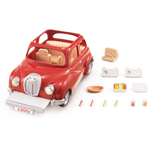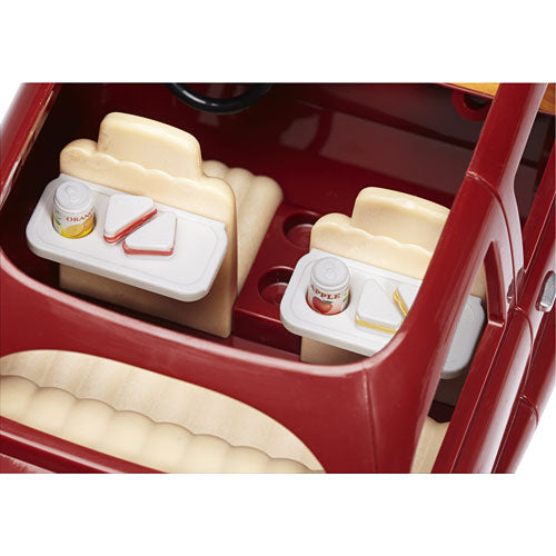 Cruise around Cloverleaf Corners in style! Fits up to 5 critters! Tires and steering wheel rotate! Includes fold out picnic table, baby seat, meal trays, cans of juice, sandwiches, and baskets. Car measures 10" x 5" x 7".