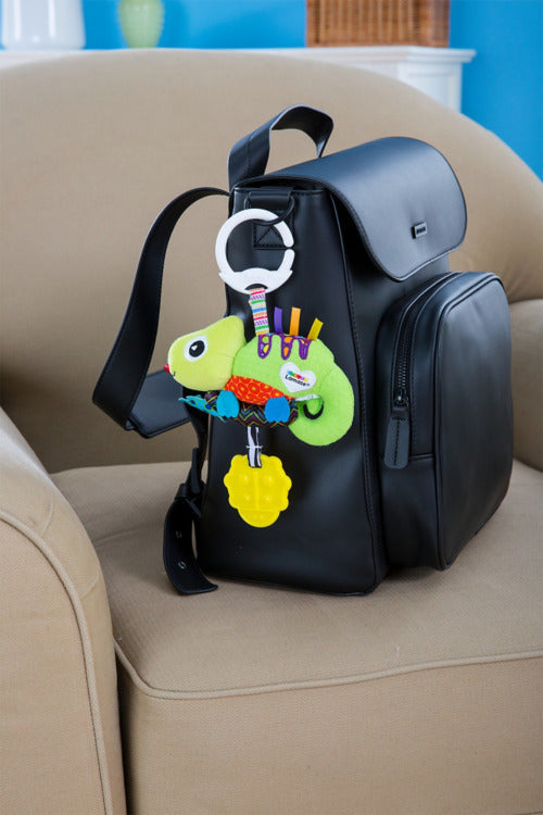 Invite a clever chameleon to play time with Lamaze’s Chroma Chameleon™ developmental toy. Engaging textures and crinkling sounds make grabbing and squeezing this toy more fun for baby. This hands-on toy is perfect for helping baby develop tactile skills. Contrasting patterns and bright colors provide baby with visual stimulation during play time. The Lamaze on-the-go clip lets you hook this cute baby toy to strollers, carriers and diaper bags for fun where ever you go.