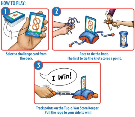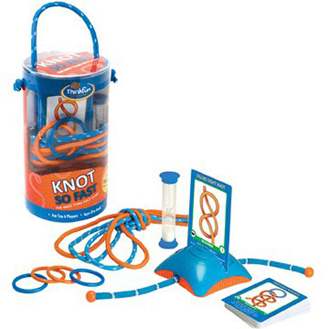 Knot So Fast is a multi-player knot tying race game. Players earn points by being first to correctly tie the knot shown on each challenge card. The rules are simple, but a few clever twists even the playing field for beginners and experts to play together. Knot So Fast introduces a wide variety of knots, requiring players to think with their hands and exercise spatial skills. Great for scouts and sailors of all ages, and for anyone who enjoys a hands-on challenge!