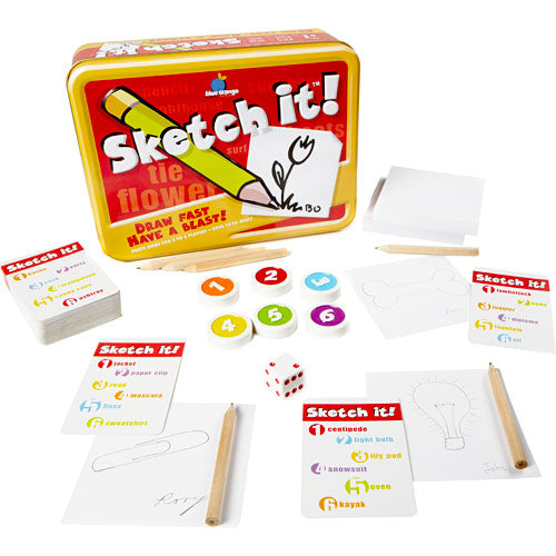 Each card lists 6 items. The number rolls tells you whatyou will sketch. Each person will sketch a different item,and do so all at the same time. Draw fast so you can grabthe highest-valued tokens. But don't draw too fast or you'llstump your opponent. In Sketch it, you score points twoways: When the player who received your drawing guesseswhat you've drawn, and when you can figure out themasterpiece you received.After 10 rounds, the one with the most points wins! You'reeither the best artist, the best decipherer, a little of both, ormaybe just the luckiest. No matter how it ends, players willsketch, laugh, and try to outsmart each other down to thenub.