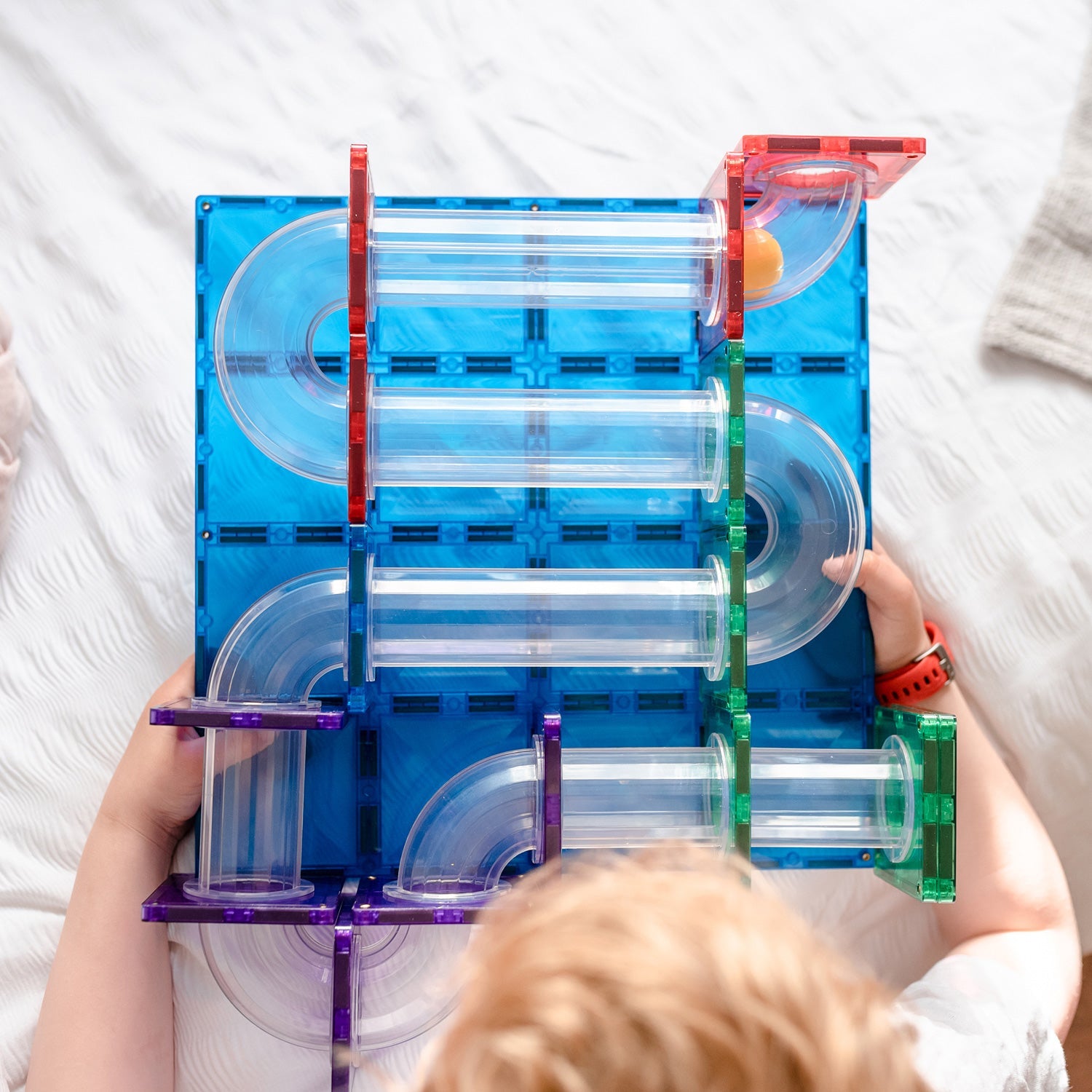 Enjoy endless opportunities for STEAM learning and open-ended play with this gorgeous magnetic ball run. Curious kiddos explore gravity, motion, force, and more as they build fascinating designs based on the 43-page idea booklet or their own imaginations! The 92 colorful pieces include clear fluted tubes, wooden balls, and rainbow connector tiles to create a range of exciting twists, turns, slopes and soundscapes. Please note, this pack does not include any standard CONNETIX tiles.