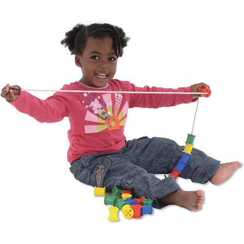 Set of 20 cotton reels in 4 bright colours plus a chunky threading cord. Ideal for threading and stacking to encourage hand/eye coordination and manual dexterity. Made from tough, durable plastic.