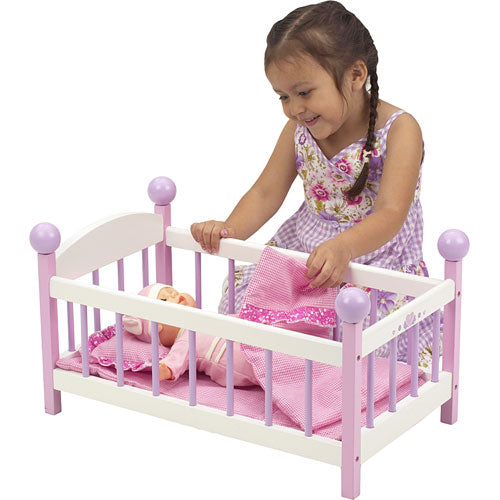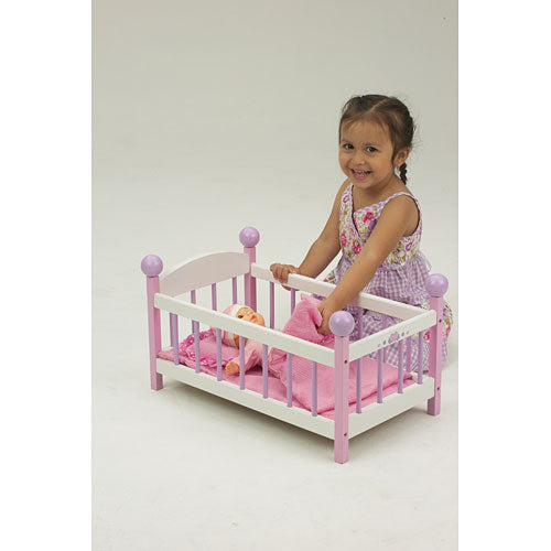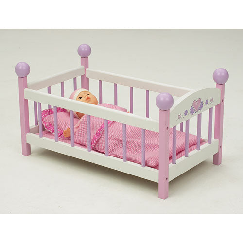 A finely finished, sturdy wooden crib with a pretty, screened floral design. Comes with a pillow, quilted sheet and comforter. Fits all dolls up to 18-".