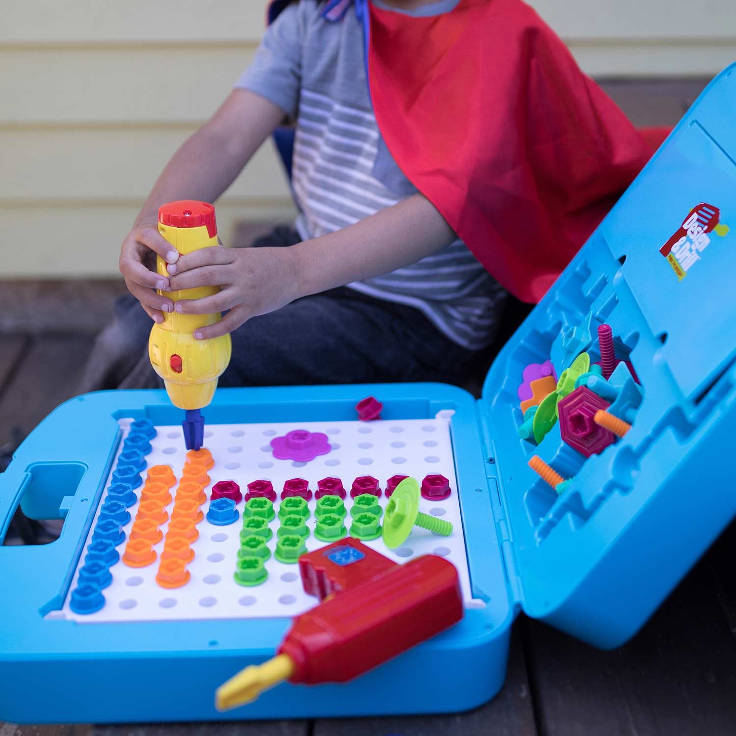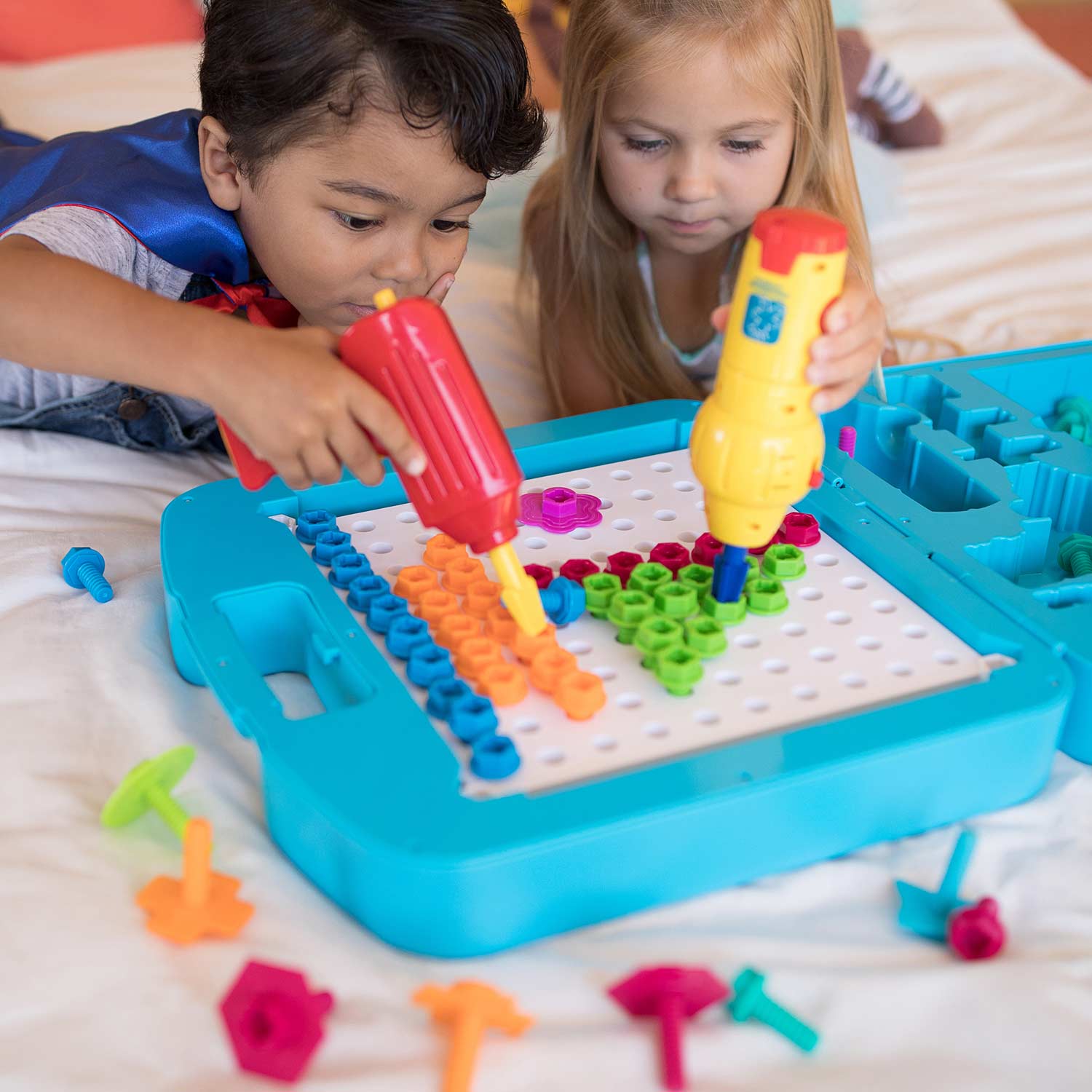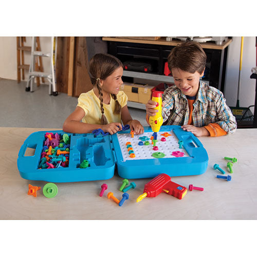 Includes power drill, power screwdriver, wrench, screwdriver, 100 big bolts in 5 colors, 20 Fun Bolts in 5 shapes and colors, 3 bits (Phillips, socket, flathead), and activity guide with 19 patterns to follow