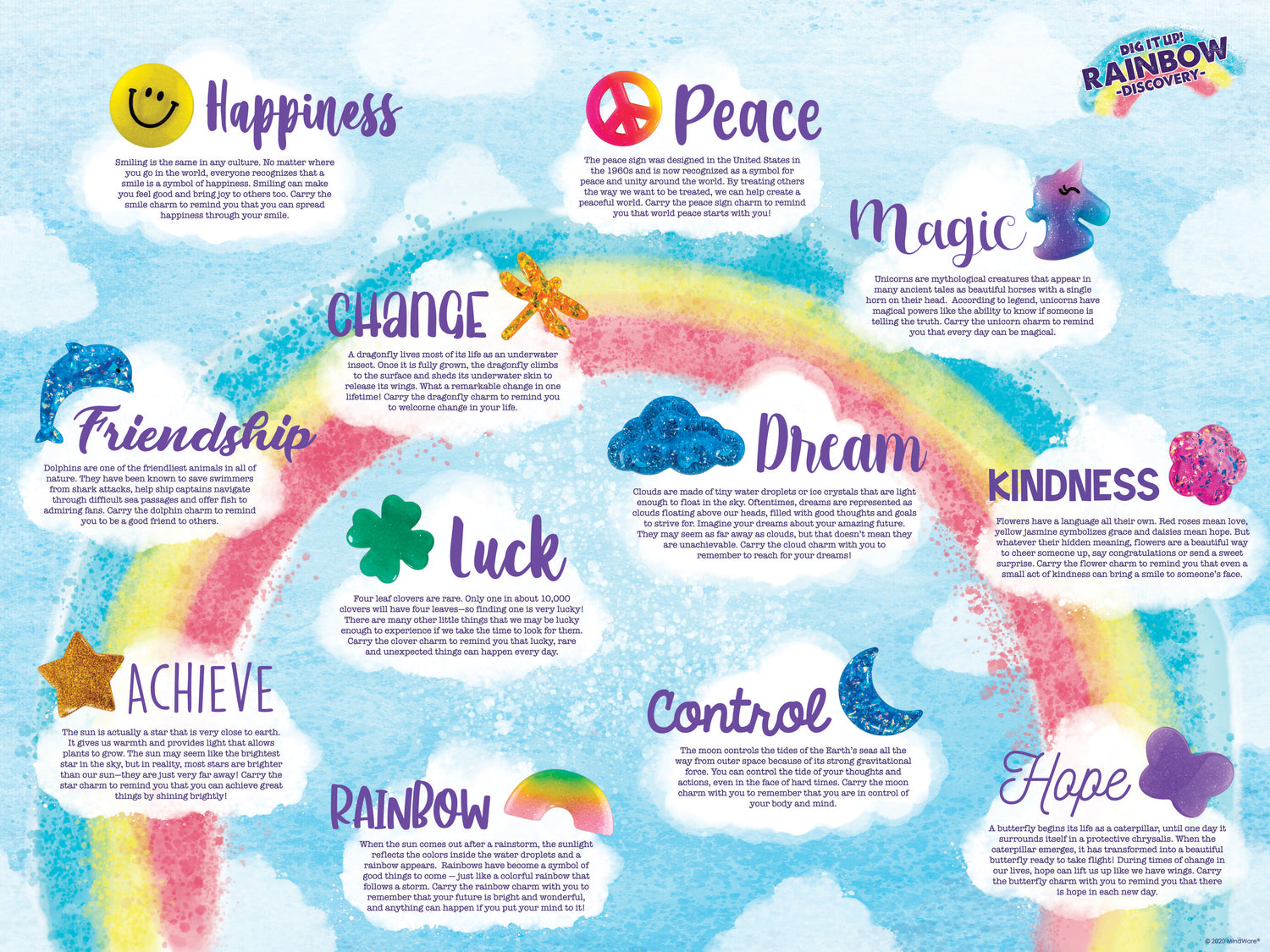- Includes a charm-filled rainbow project measuring approx. 7” long, a mini treasure dig, 13 total charms, 2 chiseling tools, 1 hammer, 1 excavation brush, 1 sponge, an infographic empowerment poster and a guidebook/excavation journal